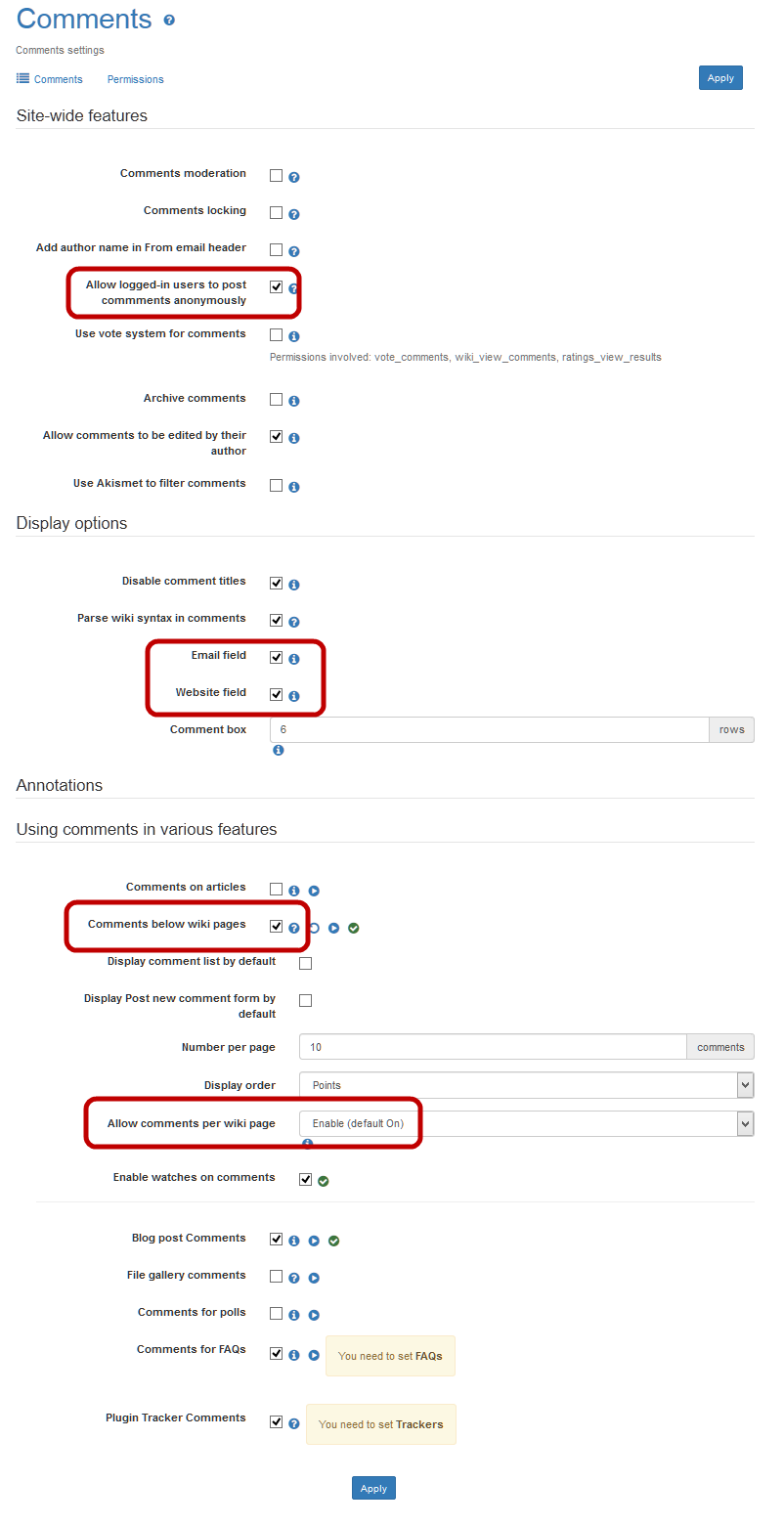 - Allow comments per wiki page : Select Enable (default on). This allows you to enable the comments for wiki pages. By default, all pages will allow comments, but you can override this on a page-by-page basis.