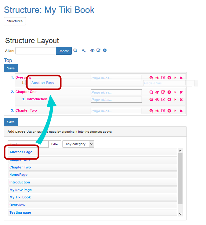 Tiki highlights the structure, as you add the page. - Notice that the structure now includes Another Page after the Overview.