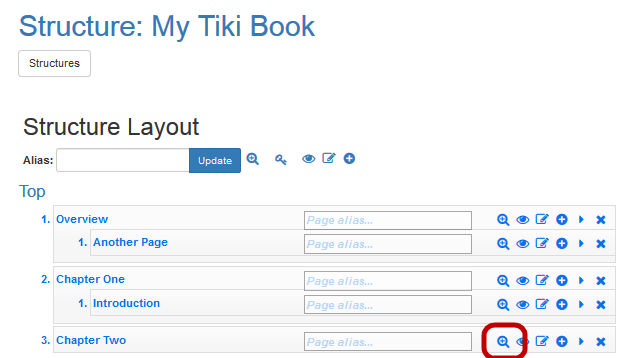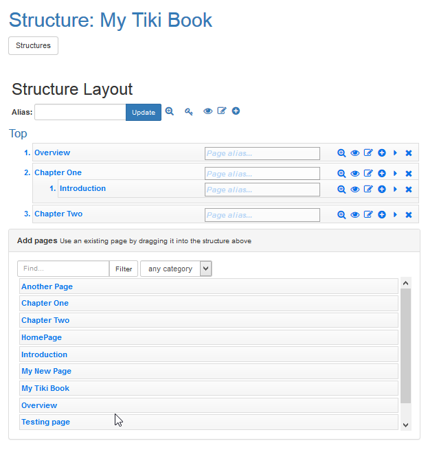 - From the Structures page, click the name of the structure (use the My Tiki Book that you created earlier) in which to add a page. The Modify Structure page appears.
