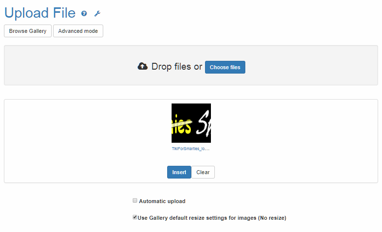 Click and drag the image from your PC desktop to the Drop files area in the Upload File window. - Click Upload. After successfully uploading the file, Tiki shows you a thumbnail of the image (generated automatically).
