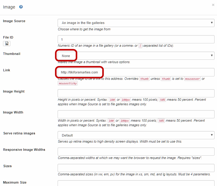 Click Additional Info to display the necessary HTML and wiki code to use this image in a page. - Click Insert. Tiki closes the Upload window and automatically inserts the necessary wiki syntax to the Edit area: