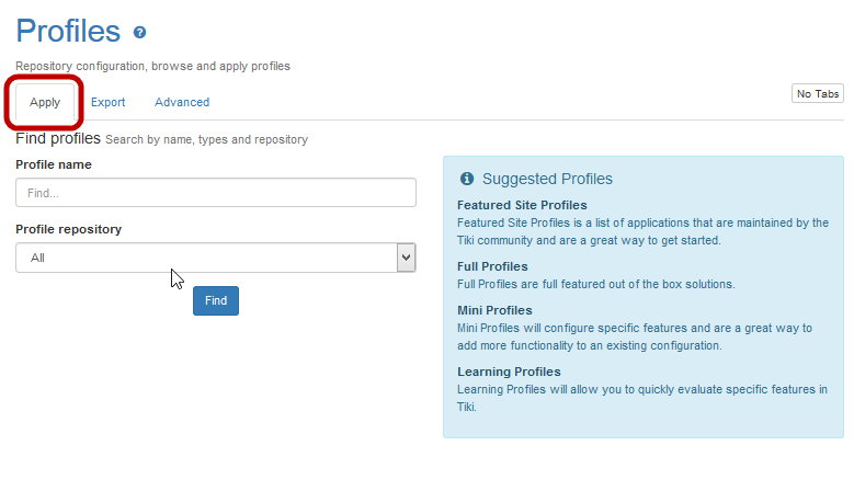 TipYou can also access the Administration: Profiles page by typing http://www.yourdomain.com/tiki-admin.php?page=profiles in your web browser.