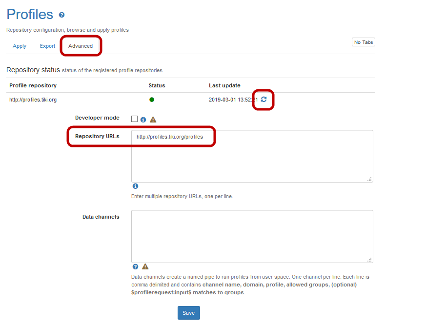 TipUse the Advanced tab to configure additional profile repositories and data channels.