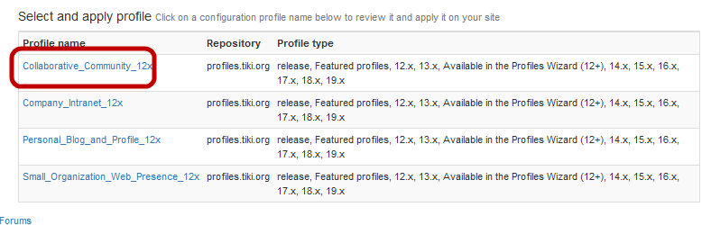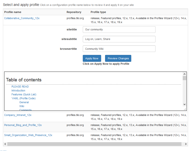 To apply a profile to your site, Tiki must contact a profile repository and download the configuration information. By default, Tiki is configured to use the official Tiki Profiles repository at http://profiles.tiki.org.