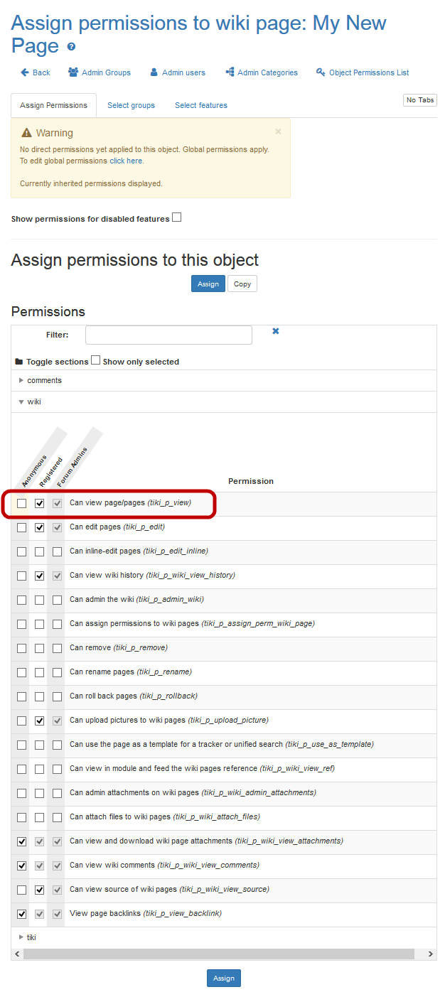- On the Assign Permissions tab, unselect the Can view page/pages option for the Anonymous group. Notice that Tiki automatically unselects the option for the other groups, too, because these groups all inherit permissions from the Anonymous group. See Configuring Group Permissions for details on how groups inherit permissions from other groups.