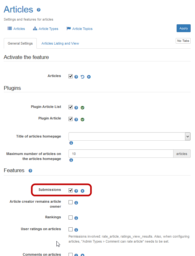 - Enable Submissions in the features area. This will allow visitors to submit new articles to your site.