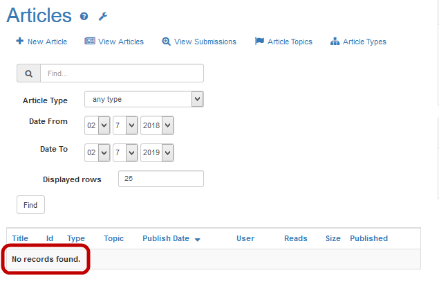- From the menu, select Articles > List Articles. The Articles page appears. The Articles page lists the current articles. Right now there are no articles.