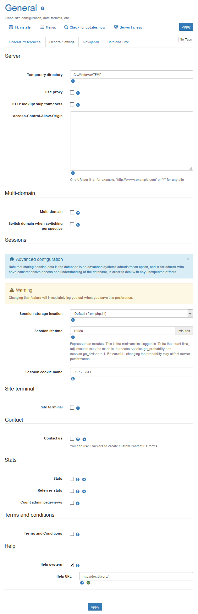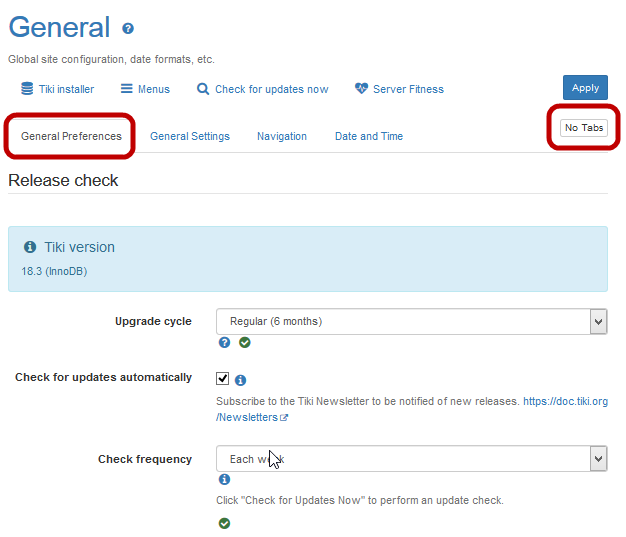 - The General control panel contains general Tiki options that apply to your entire site. The General control panel contains the following tabs: