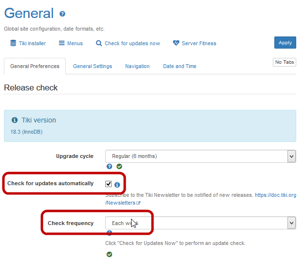 NoteBy default, Tiki will automatically check for updates each week. If a newer release is available, the following message will appear at the top of the Administration pages: