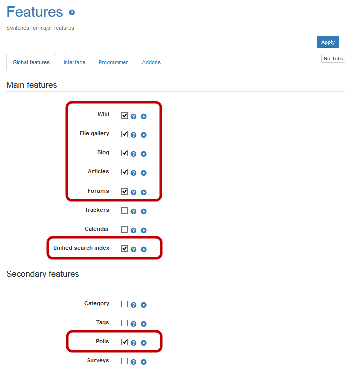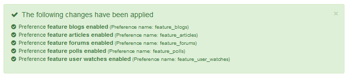 - Click Apply. Tiki saves the changes and reloads the page, confirming that the features are now enabled.
