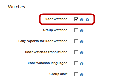 The Wiki, File Gallery, and Unified Search Index features should be enabled, by default, for a new Tiki default profile installation. - In the Watches area, select User Watches .