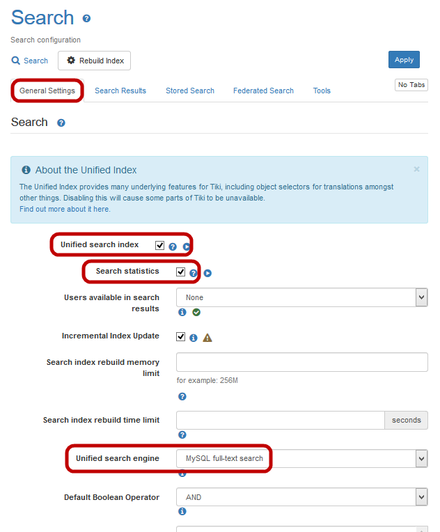Leave the other options as their defaults. - Click the Search Results tab to specify what options Tiki will include on the results page.