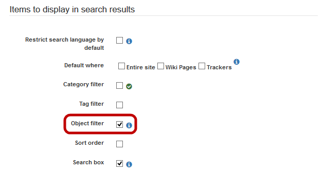 - In the Items to display in search results area, enable the Object filter option. This will allow users to filter their search results by Tiki object (that is, show only wiki pages, or articles, or trackers, etc.)