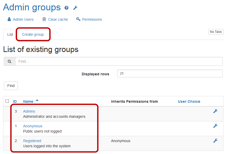 You can also access the Admin Groups page by clicking the Groups button in the Quick Admin module. - The Admin Groups page lists the existing groups: Admins, Anonymous, and Registered.