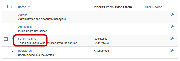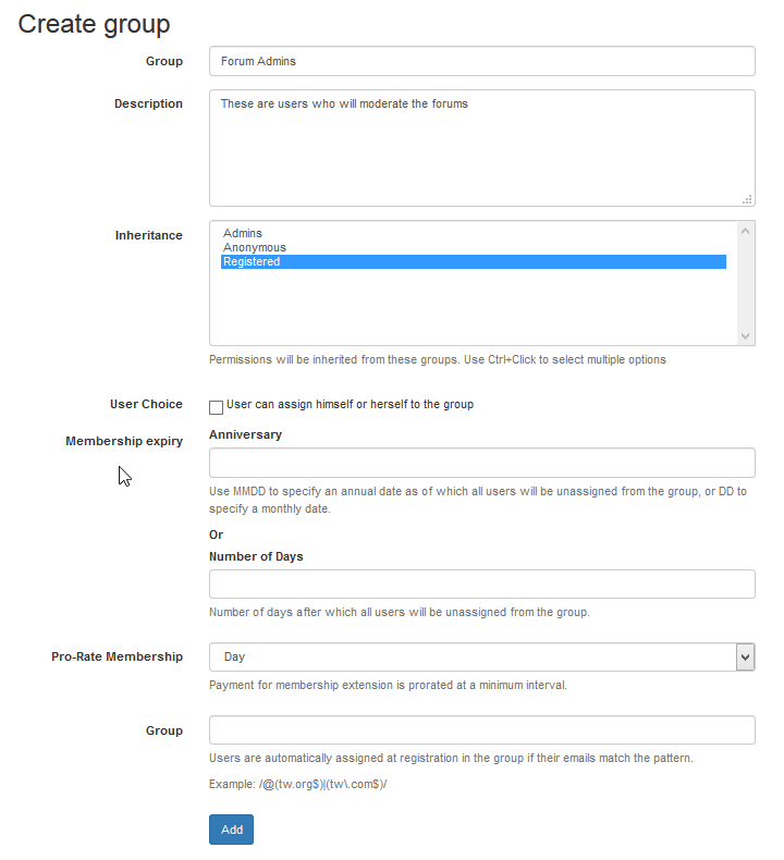 - Inherit: Select Registered. This will let Forum Admins inherit all of the permissions that registered users have. Later, we'll add additional permissions to allow Forum Admins to moderate the forum.