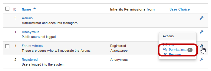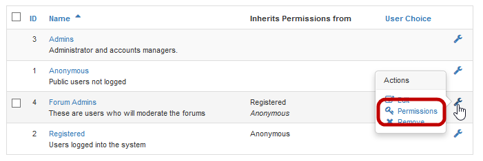 - In the List of Existing Groups area of the Admin Groups page, click the Actions icon for the Forum Admins group, the click Permissions in the pop-up window.