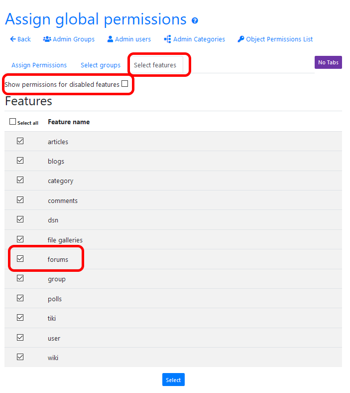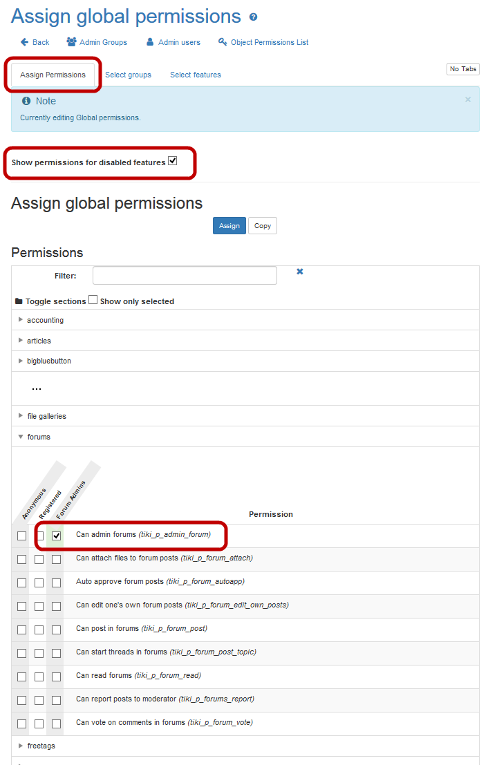 - For the Forum Admins group, select the Can admin forums (tiki_p_admin_forum) and click Assign.