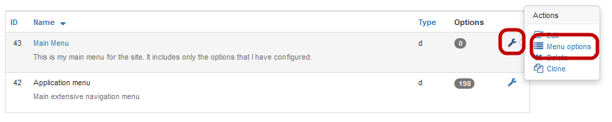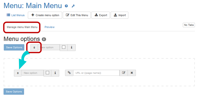 - In the Menu Options area of the page, click and drag the New Option menu item into the Menu builder area