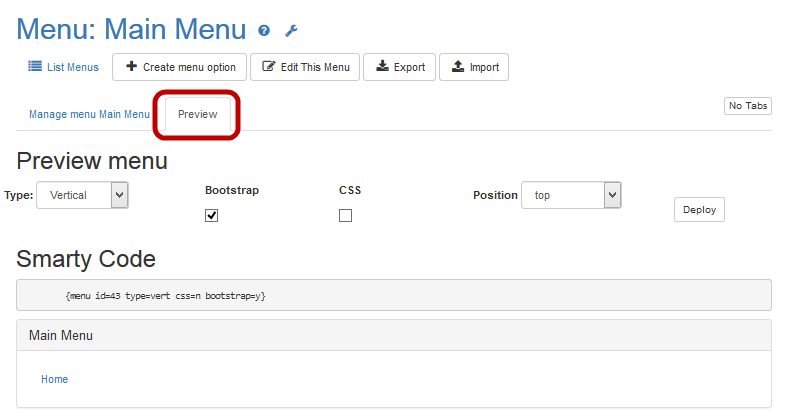 - Click the Preview tab to display a preview of the menu. The preview shows the menu title and the link to the home page.