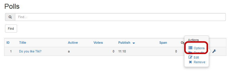 - On the Polls tab of the Admin Polls page, select Actions > Options for your newly created poll.