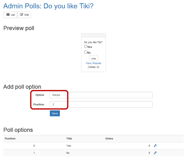 - Click Save. Tiki saves the information and reloads the page. The poll preview now includes the Maybe option.