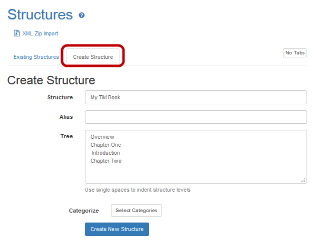 Use the Alias field to create a "display" name for the page. This allows you to create pages that appear to have the same name, even though Tiki requires a unique page name for each wiki page. See Using a Page Alias for more information. - Tree: When you create a new structure, you can have Tiki automatically create a set of wiki pages in the structure. (Later, you will learn how to add existing wiki pages to the structure, or create new pages in the structure.