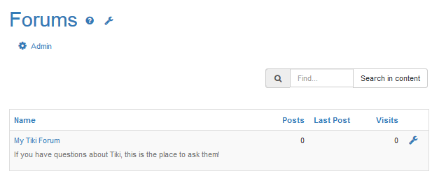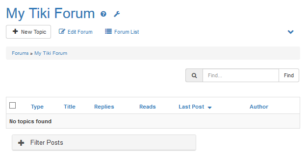 - The Forum page lists all the topics (and their threads) in the forum. Since this is a new forum, Tiki tells you that there are no topics to display.