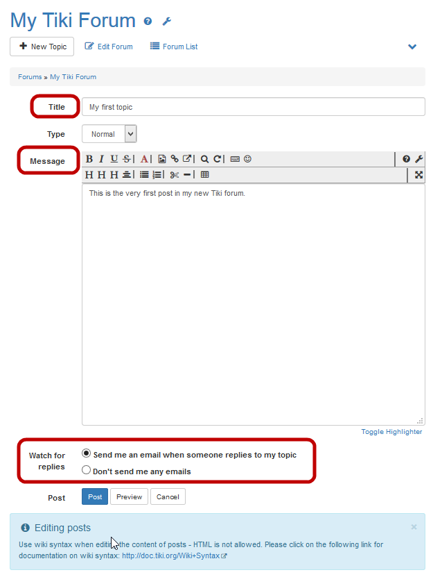 - Watch for replies: By default, the Send me an e-mail when someone replies to my topic option is selected. This allows you to monitor the thread. Tiki will send you an email each time another user responds to your post.