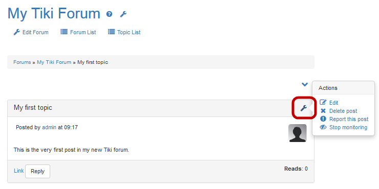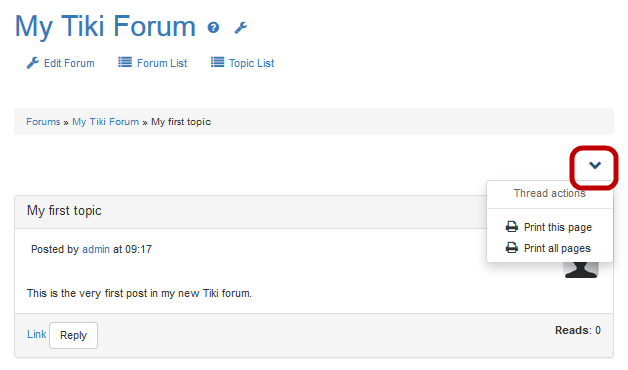 You will learn about thread types later. - Click Post. Tiki saves the posts and displays the Forum post page.