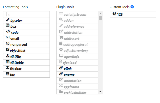 • Plugin Tools — These are buttons to add plugins to wiki pages. Only plugins that have been enabled are available.