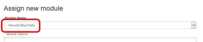 You can also add a new module by clicking the All Modules tab, then dragging the selected module into position. - In the Assign new module area, select Newest blog posts as the Module name. This module will display the newest (most recently added) blog posts.