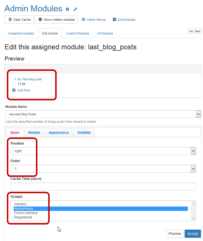 Since you only have 1 blog post, the module only lists 1 item, even though you selected 5 rows. - If everything looks good, click Assign. Tiki prompts for confirmation, then saves the information and reloads the page.