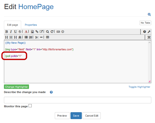- On the Edit page, in the Edit area type: {poll pollId="XX"}
