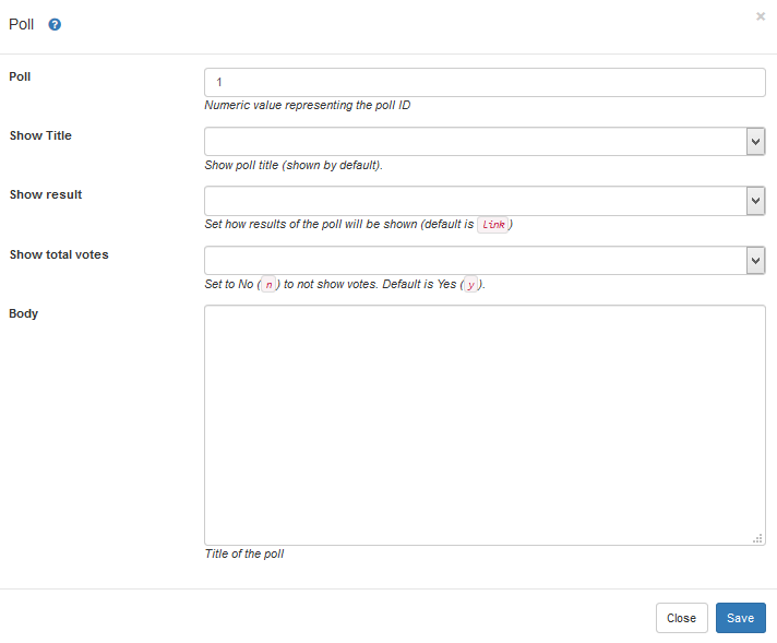 NoteIf you omit an ID number, such as {poll}, Tiki will display a random, active poll.