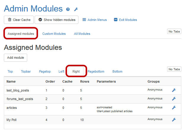 - On the Admin Modules page, click Assigned Modules tab, then select the Right module tab.