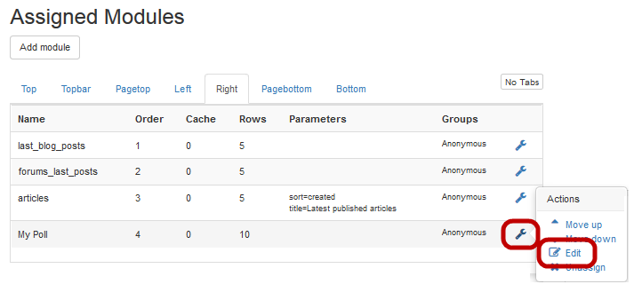 - Select Actions > Edit for the poll custom module you created previously.