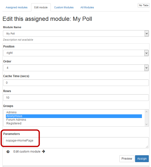 - In the Parameters area of the Edit page, type nopage=HomePage. This will turn off (hide) the poll module when the HomePage is being viewed.