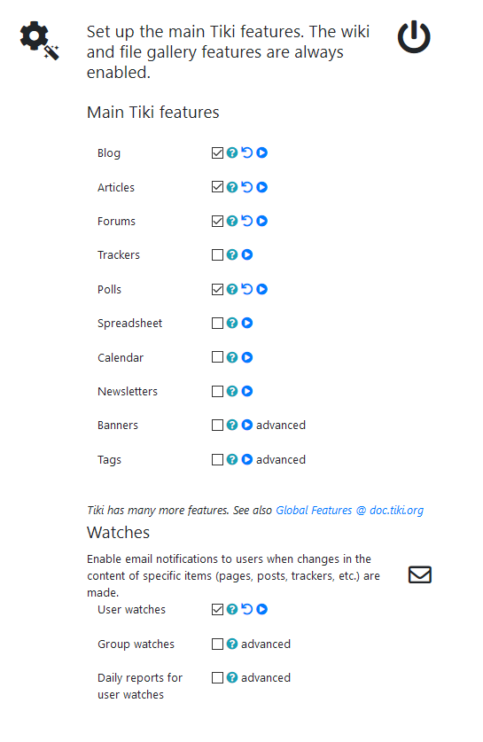 By default, Tiki starts with only the wiki and file gallery features enabled. Let's turn on others!