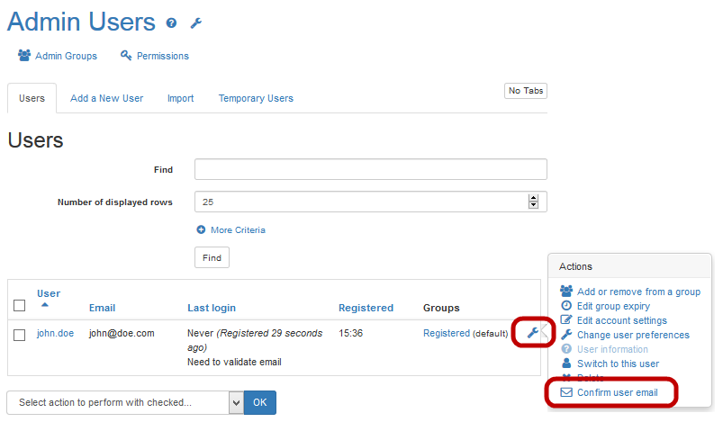 To manually validate a user, select Actions > Confirm User Email on the Administration: Users page.