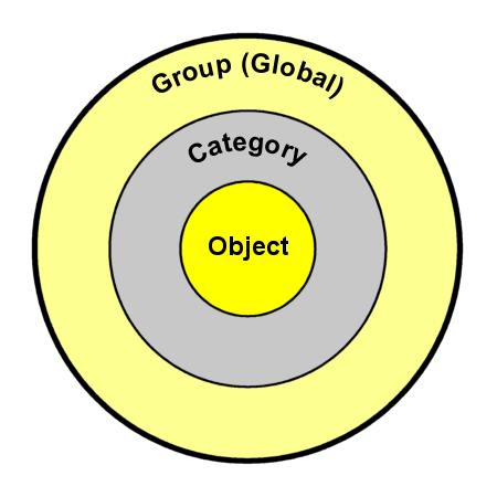 Permissions are inherited from from the top-down, but override from the bottom-up. This image illustrates the relationship among Group, Category, and Object permissions:
