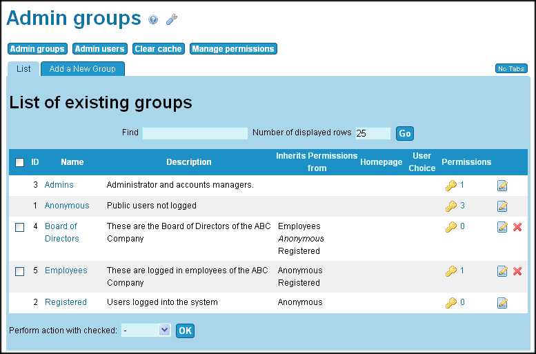 Notice that some groups include other groups. For example, members of the Board of Directors group will include, in addition to their own permissions, the permissions from the Employees, Registered, and Anonymous groups.