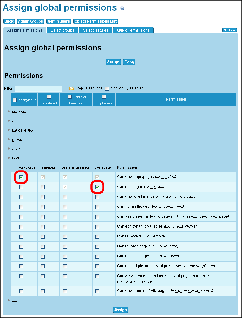 - To let employees edit pages, assign tiki_p_edit to Employees.