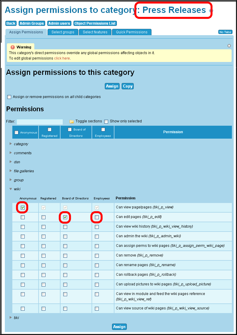 - For the Press Releases category, remove tiki_p_edit from Employee. Now only the Board of Directors group can edit wiki pages in the category.