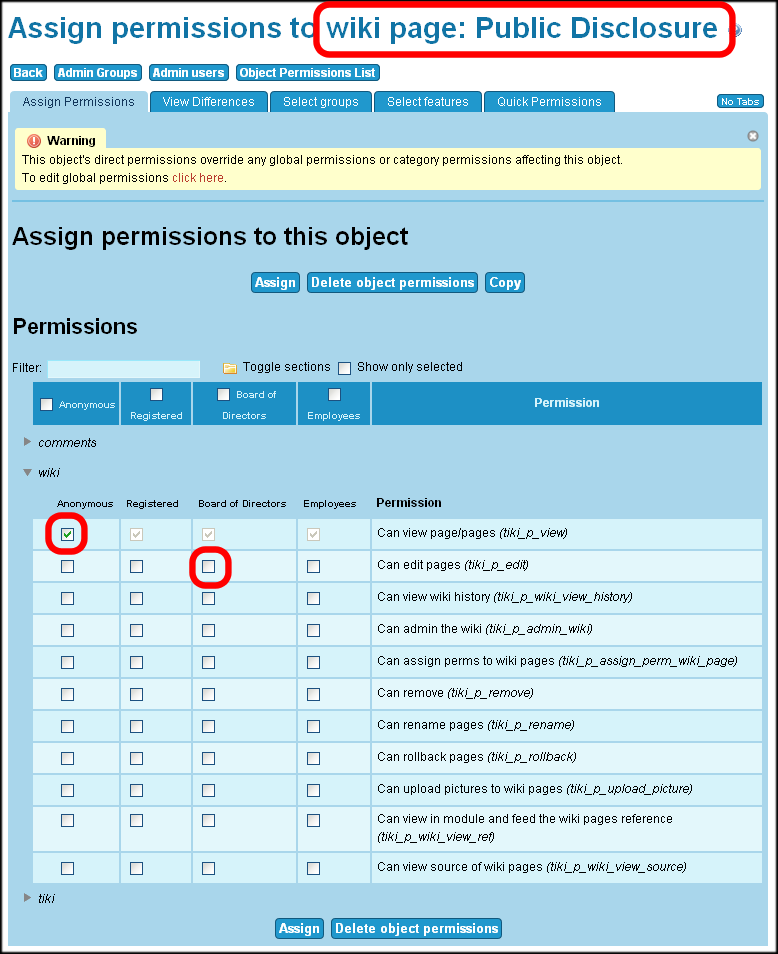 - The Board of Directors group includes the Anonymous, Registered, and Employees groups. Therefore, the Board of Directors group inherits the tiki_p_view and tiki_p_edit permission from these groups.