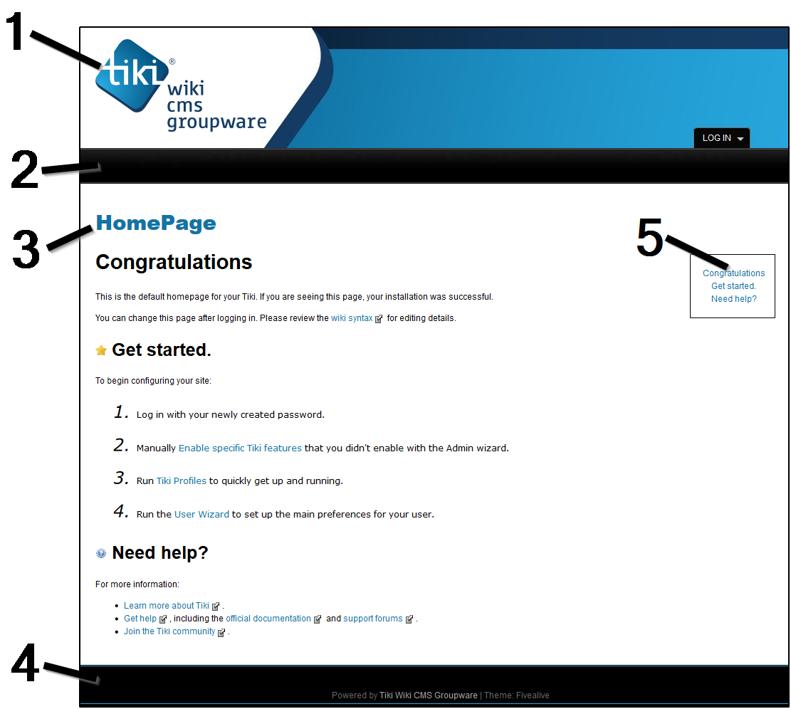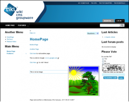 Here is the "meat" of your Tiki. The content in this area will vary, depending on what features you're using. It might show blogs, forums, or images. Right now, you're looking a wiki page — the HomePage.