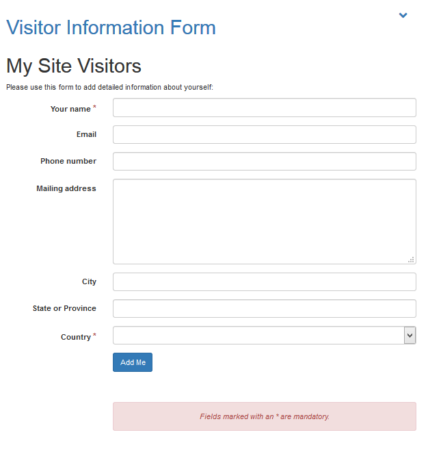 !My Site Visitors Please use this form to add detailed information about yourself: {TRACKER(trackerId=>1, fields=>1:2:3:4:5:6:7, action=>Add Me, showmandatory=>y)}Thank you!{TRACKER}