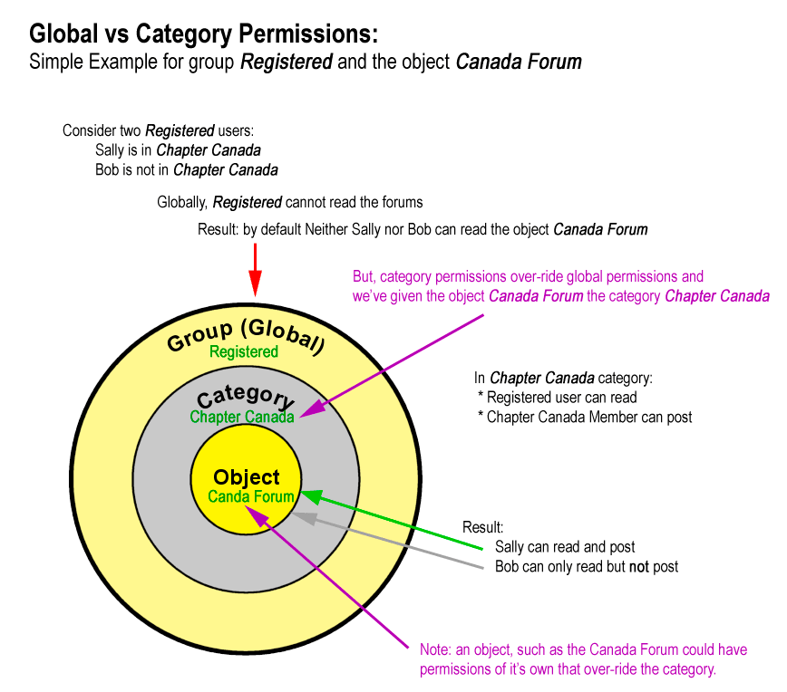Note that the same objective could be achieved by using the Object permissions directly. However, this would mean every single Canada-related forum would have to have individual permissions set.